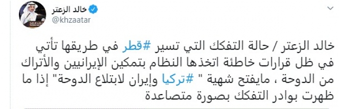 وكتب في تغريدة عبر "تويتر" رصدها "المشهد العربي": "حالة التفكك التي تسير قطر في طريقها تأتي في ظل قرارات خاطئة اتخذها النظام بتمكين الإيرانيين والأتراك من الدوحة، ما يفتح شهية تركيا وإيران لابتلاع الدوحة إذا ما ظهرت بوادر التفكك بصورة متصاعدة".