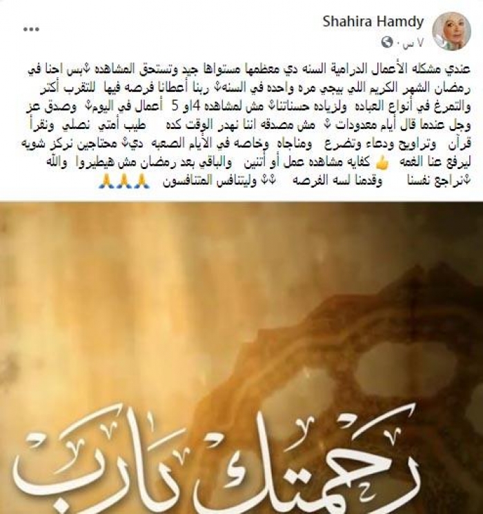ووجهت شهيرة، رسالة لجمهورها ومتابعيها عبر حسابها بـ"فيس بوك"، قائلة: "عندي مشكلة الأعمال الدرامية السنة دي معظمها مستواها جيد وتستحق المشاهدة بس إحنا في رمضان الشهر الكريم اللي بييجي مرة واحدة في السنة ربنا أعطانا فرصة فيها للتقرب أكتر والتفرغ لأنواع العبادة ولزيادة حسناتنا مش لمشاهدة 4 أو 5 أعمال في اليوم".