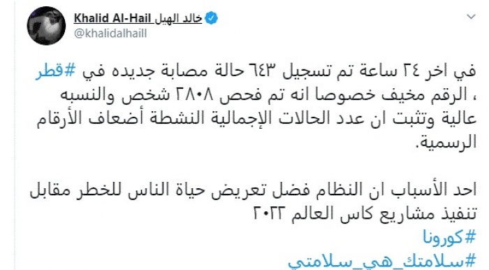 وقال في تغريدة عبر "تويتر" رصدها "المشهد العربي": "في آخر ٢٤ ساعة تم تسجيل ٦٤٣ حالة مصابة جديده في قطر، الرقم مخيف خصوصًا أنه تم فحص ٢٨٠٨ شخص والنسبه عالية وتثبت أن عدد الحالات الإجمالية النشطة أضعاف الأرقام الرسمية".