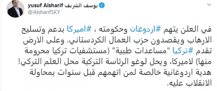 وقال في تغريدة عبر "تويتر" رصدها "المشهد العربي": "في العلن يتهم أردوغان وحكومته، أميركا بدعم وتسليح الإرهاب ويقصدون حزب العمال الكردستاني".