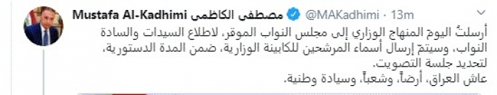 وقال في تغريدة عبر "تويتر" رصدها "المشهد العربي": "أرسلتُ اليومَ المنهاج الوزاري إلى مجلس النواب الموقر، لإطلاع السيدات والسادة النواب، وسيتمّ إرسال أسماء المرشحين للكابينة الوزارية، ضمن المدة الدستورية، لتحديد جلسة التصويت. عاش العراق، أرضاً، وشعباً، وسيادة وطنية".