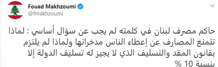وقال في تغريدة عبر "تويتر" رصدها "المشهد العربي": "حاكم مصرف لبنان في كلمته لم يجب عن سؤال أساسي: لماذا تتمنع المصارف عن إعطاء الناس مدخراتها ولماذا لم يلتزم بقانون المقد والتسليف الذي لا يجيز له تسليف الدولة إلا بنسبة 10 %".