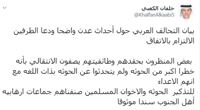 وكتب الكعبي عبر تغريدة له على "تويتر" رصدها " المشهد العربي":"بيان التحالف العربي حول أحداث عدن واضحا ودعا الطرفين الالتزام بالاتفاق".