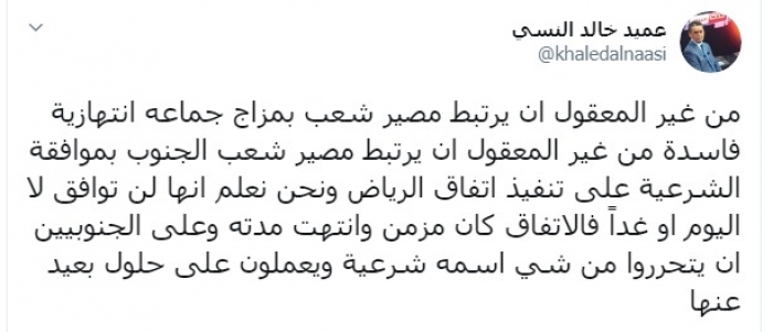وكتب النسي عبر تغريدة له على "تويتر" رصدها المشهد العربي":"من غير المعقول أن يرتبط مصير شعب بمزاج جماعة انتهازية فاسدة من غير المعقول أن يرتبط مصير شعب الجنوب بموافقة الشرعية على تنفيذ اتفاق الرياض".