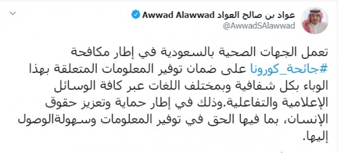 وكتب العواد عبر تغريدة له على "تويتر" رصدها " المشهد العربي":"تعمل الجهات الصحية بالسعودية في إطار مكافحة جائحة كورونا على ضمان توفير المعلومات المتعلقة بهذا الوباء بكل شفافية وبمختلف اللغات عبر كافة الوسائل الإعلامية والتفاعلية".