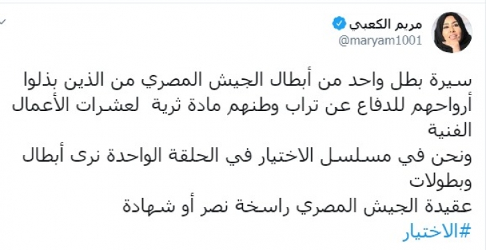 وكتبت الكعبي عبر تغريدة لها على "تويتر" رصدها " المشهد العربي":"سيرة بطل واحد من أبطال الجيش المصري من الذين بذلوا أرواحهم للدفاع عن تراب وطنهم مادة ثرية لعشرات الأعمال الفنية".