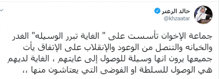 وكتب الزعتر عبر تغريدات له على "تويتر" رصدها " المشهد العربي":"جماعة الإخوان تأسست على " الغاية تبرر الوسيلة" الغدر والخيانة والتنصل من الوعود والانقلاب على الاتفاق يأتون جميعها، يرون أنها وسيلة للوصول إلى غايتهم ، الغاية لديهم هي الوصول للسلطة أو الفوضى التي يعتاشون منها".