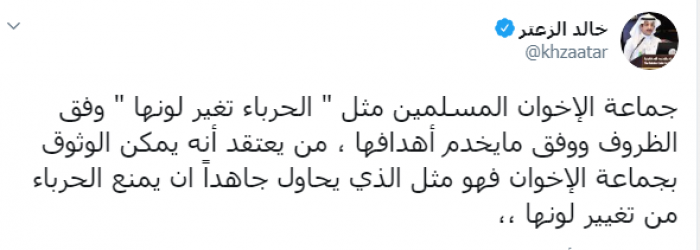 وتابع :"جماعة الإخوان المسلمين مثل " الحرباء تغير لونها " وفق الظروف ووفق ما يخدم أهدافها ، من يعتقد أنه يمكن الوثوق بجماعة الإخوان فهو مثل الذي يحاول جاهداً أن يمنع الحرباء من تغيير لونها".