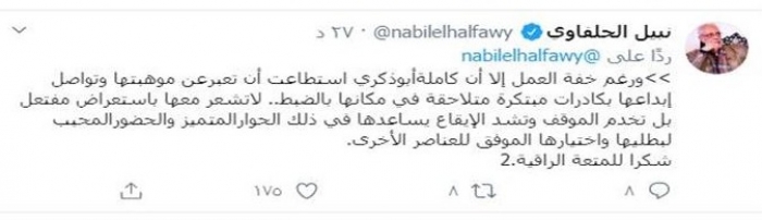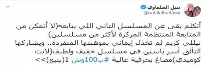 وكتب الحلفاوي: "أتكلم بقى عن المسلسل التاني اللي بتابعه(لا أتمكن من المتابعة المنتظمة المركزة لأكثر من مسلسلين).