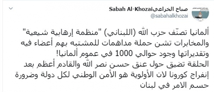 وكتب الخزاعي عبر تغريدة له على "تويتر" رصدها " المشهد العربي":"ألمانيا تصنّف حزب الله (اللبناني) "منظمة إرهابية شيعية" والمخابرات تشن حملة مداهمات للمشتبه بهم أعضاء فيه وتقديراتها وجود حوالي 1000 في عموم ألمانيا".