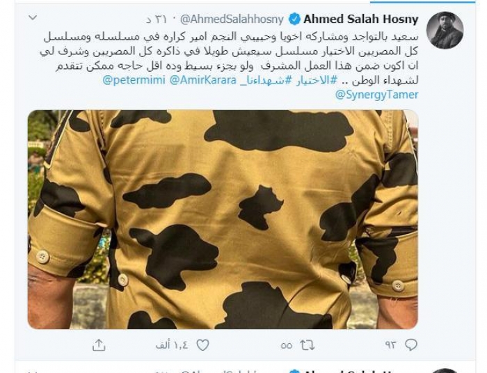 نشر الفنان أحمد صلاح حسني، عبر حسابه الشخصي بموقع "تويتر"، صورة يعلن بها مشاركته في مسلسل الاختيار.