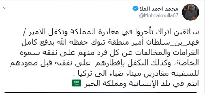 وكتب الملا عبر تغريدة له على "تويتر" رصدها " المشهد العربي":"سائقين أتراك تأخروا في مغادرة المملكة وتكفل الأمير فهد بن سلطان أمير منطقة تبوك حفظه الله بدفع كامل الغرامات والمخالفات عن كل فرد منهم على نفقة سموه الخاصة".
