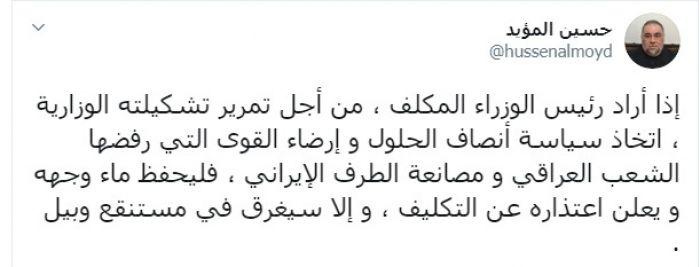 وكتب المؤيد عبر تغريدة له على "تويتر" رصدها " المشهد العربي":"إذا أراد رئيس الوزراء المكلف ، من أجل تمرير تشكيلته الوزارية ، اتخاذ سياسة أنصاف الحلول و إرضاء القوى التي رفضها الشعب العراقي و مصانعة الطرف الإيراني ، فليحفظ ماء وجهه و يعلن اعتذاره عن التكليف ، و إلا سيغرق في مستنقع وبيل".