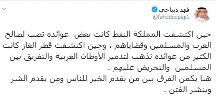 وكتب ديباجي عبر تغريدة له على "تويتر" رصدها "المشهد العربي":"حين اكتشفت المملكة النفط كانت بعض عوائده تصب لصالح العرب والمسلمين وقضاياهم ، وحين اكتشفت قطر الغاز كانت الكثير من عوائده تذهب لتدمير الأوطان العربية والتفريق بين المسلمين والتحريض عليهم".