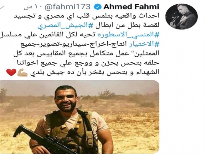 ونشر فهمي، صورة المنسي عبر حسابه على تويتر، وعلق: "أحداث واقعية بتلمس قلب أي مصري وتجسيد لقصة بطل من أبطال الجيش المصري، المنسي، الأسطورة".