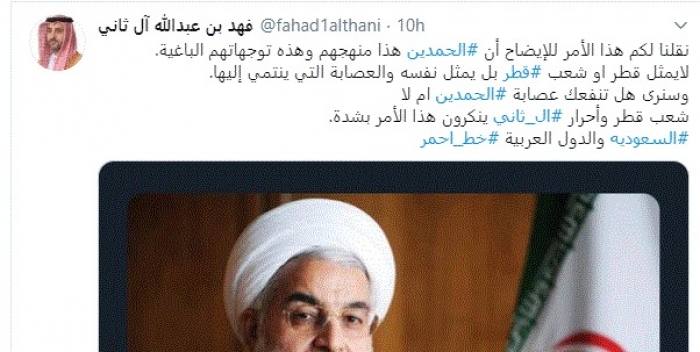 وقال في تغريدة عبر "تويتر" رصدها "المشهد العربي": "نقلنا لكم هذا الأمر للإيضاح أن الحمدين هذا منهجهم وهذه توجهاتهم الباغية. لا يمثل قطر أو شعب قطر بل يمثل نفسه والعصابة التي ينتمي إليها".