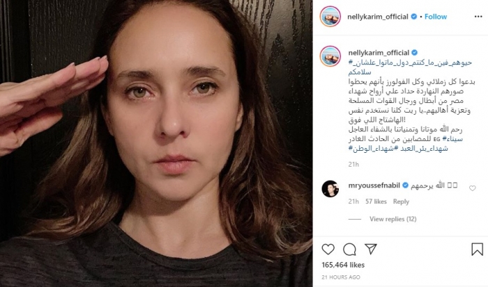 ووضعت نيللي كريم صورتها وهي تقدم التحية للشهداء، انضمامًا منها لمبادرة آسر ياسين، التي اطلقها وجاء فيها: "بدعوا كل زملائي وكل الفولورز بأنهم يحطوا صورهم النهاردة حدادً علي أرواح شهداء مصر من أبطال ورجال القوات المسلحة وتعزية أهاليهم".