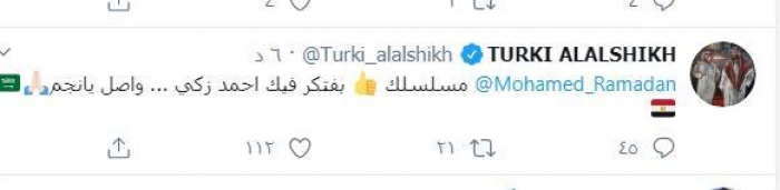 وكتب آل الشيخ:" رمضان، مسلسلك بفتكر فيك لأحمد زكي، واصل يانجم"، ووضع علم السعودية ومصر.
