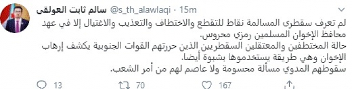 وقال في تغريدة عبر "تويتر" رصدها "المشهد العربي": "لم تعرف سقطرى المسالمة نقاط للتقطع والاختطاف والتعذيب والاغتيال إلا في عهد محافظ الإخوان المسلمين رمزي محروس".