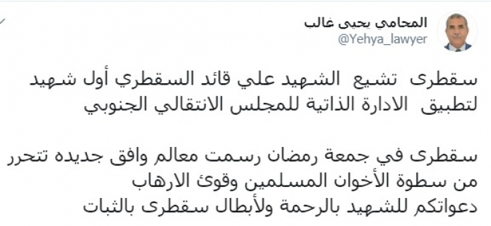 وكتب غالب عبر تغريدة له على "تويتر" رصدها " المشهد العربي":"سقطرى تشيع الشهيد علي قائد السقطري أول شهيد لتطبيق الإدارة الذاتية للمجلس الانتقالي الجنوبي".