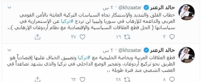 وأضاف:"قطع العلاقات العربية وبخاصة الخليجية مع تركيا وتضييق الخناق عليها اقتصاديا هو الطريق نحو تركيع أردوغان، وتفجير الوضع الداخلي في تركيا والذي يشهد تصاعداً في الغضب الشعبي منذ فترة طويلة".
