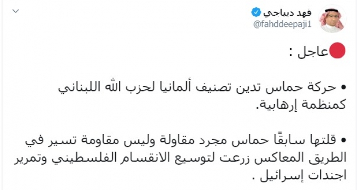 وكتب ديباجي عبر تغريدة له على "تويتر" رصدها " المشهد العربي":"عاجل :حركة حماس تدين تصنيف ألمانيا لحزب الله اللبناني كمنظمة إرهابية".