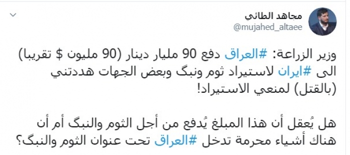 وكتب عبر تغريدة له على "تويتر" رصدها " المشهد العربي":"وزير الزراعة: العراق دفع 90 مليار دينار (90 مليون $ تقريبا) إلى إيران لاستيراد ثوم ونبك وبعض الجهات هددتني (بالقتل) لمنعي الاستيراد".