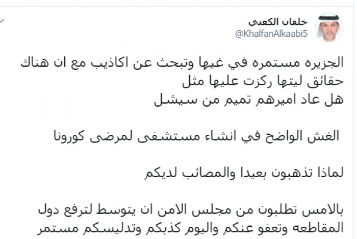 وكتب الكعبي عبر تغريدة له على "تويتر" رصدها " المشهد العربي":"الجزيرة مستمرة في غيها وتبحث عن أكاذيب مع أن هناك حقائق ليتها ركزت عليها مثل،هل عاد أميرهم تميم من سيشل".