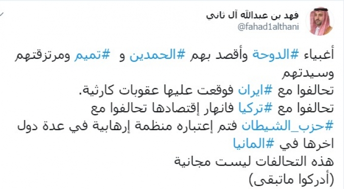 وكتب آل ثاني عبر تغريدة له على "تويتر" رصدها " المشهد العربي":" أغبياء الدوحة وأقصد بهم الحمدين و تميم ومرتزقتهم وسيدتهم،تحالفوا مع إيران فوقعت عليها عقوبات كارثية".