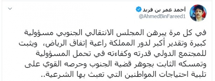 وكتب بن فريد عبر تغريدة له على "تويتر" رصدها " المشهد العربي":"في كل مرة يبرهن المجلس الانتقالي الجنوبي مسؤولية كبيرة وتقدير أكبر لدور المملكة راعية اتفاق الرياض".