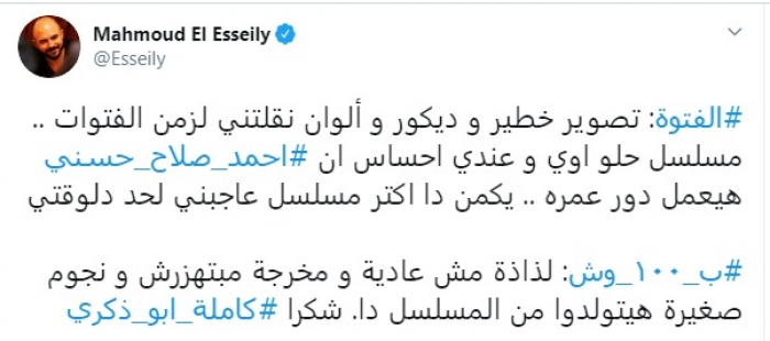 وكتب العسيلي، عبر حسابه على تويتر : "الفتوة.. تصوير خطير وديكور وألوان نقلتني لزمن الفتوات.. مسلسل حلو أوي وعندي إحساس إن أحمد صلاح حسني هيعمل دور عمره.. يمكن دا أكتر مسلسل عاجبني لحد دلوقتي".