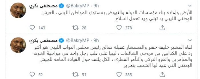 وكتب في تغريدات عبر "تويتر" رصدها "المشهد العربي": "لقاء المشير خليفة حفتر والمستشار عقيلة صالح رئيس مجلس النواب الليبي هو أكبر رد علي الكذابين من مروجي الشائعات، ليبيا علي قلب رجل واحد في مواجهة الخونة والمتآمرين والغزو التركي والتآمر القطري".