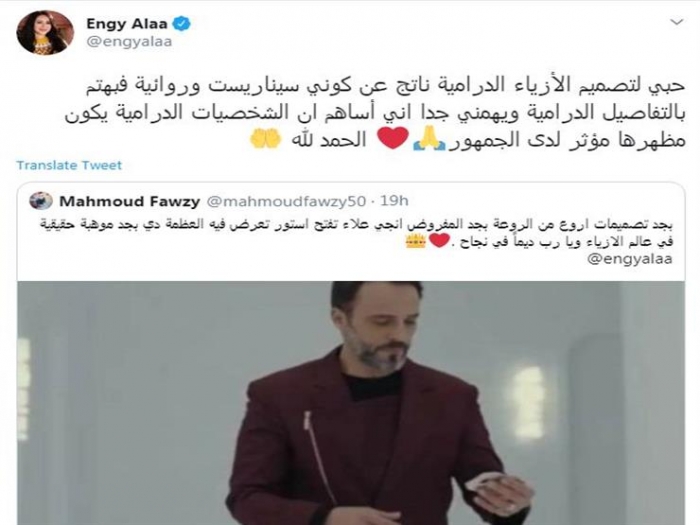 ردت السيناريست ومصممة الأزياء إنجي علاء، على تغريدة تشيد بأزياء مسلسل النهاية، التي قامت بها.