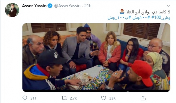 مازح الفنان آسر ياسين جمهوره، بصورة من أحد مشاهد مسلسل "بـ100 وش" عبر حسابه على تويتر.