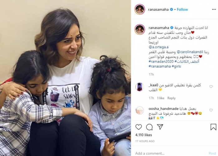 وكتبت رنا، على الصورة، قائلة: "أنا أخدت النهاردة، جرعة حنان وحب تكفيني سنة قدام، القمرات دول بنات النجم الصاحب الجدع اورتيجا وحبيبة قلبي كارولين قنديل، ربنا يحفظهم ويحميهم".
