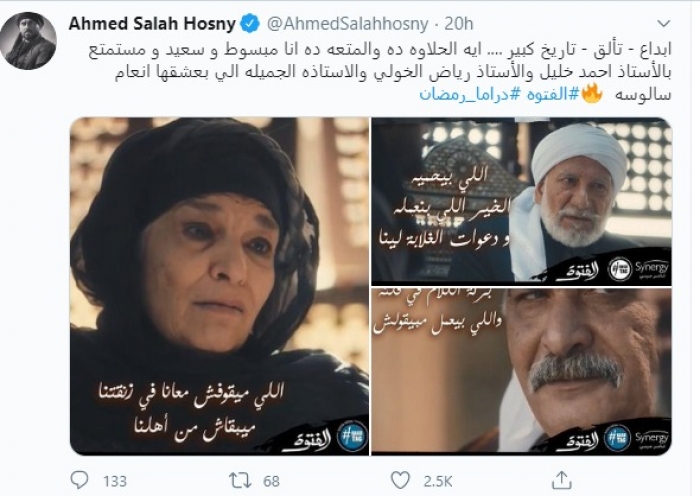 وكتب حسني، عبر حسابه على تويتر، قائلا: "إبداع - تألق - تاريخ كبير.. إيه الحلاوة دي والمتعة دي، أنا مبسوط وسعيد ومستمتع بالأستاذ أحمد خليل والأستاذ رياض الخولي والاستاذة الجميلة اللي بعشقها أنعام سالوسة، الفتوة".