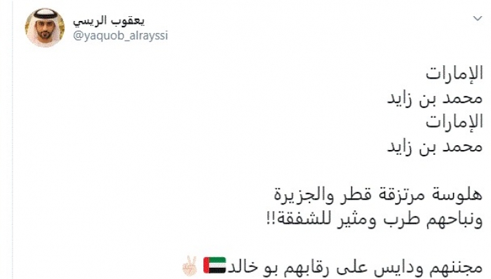 واختتم "الريسي" تغريدته فخورًا بولي عهد أبوظبي الشيخ محمد بن زايد قائلاً: "مجننهم ودايس على رقابهم بو خالد".