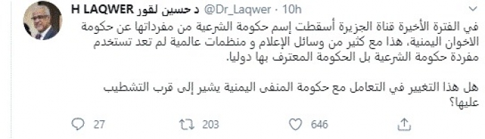وقال في تغريدة عبر "تويتر" رصدها "المشهد العربي": "في الفترة الأخيرة قناة الجزيرة أسقطت اسم حكومة الشرعية من مفرداتها عن حكومة الإخوان اليمنية، هذا مع كثير من وسائل الإعلام ومنظمات عالمية لم تعد تستخدم مفردة حكومة الشرعية بل الحكومة المعترف بها دوليًا".