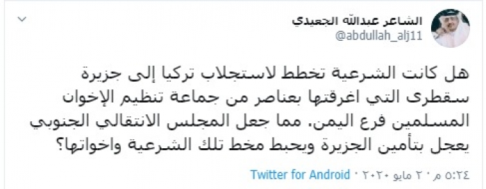 وكتب "الجعيدي" في تغريدة عبر حسابه الشخصي بتويتر، رصدها "المشهد العربي" قال فيها: "هل كانت الشرعية تخطط لاستجلاب تركيا إلى جزيرة سقطرى التي أغرقتها بعناصر من جماعة تنظيم الإخوان المسلمين فرع اليمن، مما جعل المجلس الانتقالي الجنوبي يعجل بتأمين الجزيرة ويحبط مخطط تلك الشرعية وأخواتها؟".
