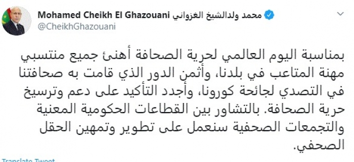 أكد الرئيس الموريتاني محمد ولد الشيخ الغزواني، اليوم، أنه سيعمل على تطوير وتمهين الحقل الصحفي وذلك بمناسبة اليوم العالمي لحرية الصحافة.