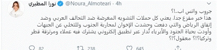 وقالت في تغريدة عبر "تويتر" رصدها "المشهد العربي": "جروب واتس آب.. هذا خبر مفزع جدًا. يعني كل حملات التشويه المغرضة ضد التحالف العربي وضد اتفاق الرياض".