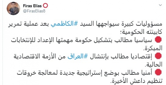وقال في تغريدة عبر "تويتر" رصدها "المشهد العربي": "مسؤوليات كبيرة سيواجهها السيد الكاظمي بعد عملية تمرير كابينته الحكومية؛ سياسيًا مطالب بتشكيل حكومة مهمتها الإعداد للانتخابات المبكرة".