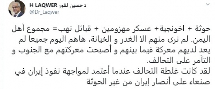 وقال في تغريدة عبر "تويتر" رصدها "المشهد العربي": "حوثة + إخونجية+ عسكر مهزومين + قبائل نهب= مجموع أهل اليمن. لم نرى منهم إلا الغدر والخيانة، ها هم اليوم جميعًا لم يعد لديهم معركة فيما بينهم وأصبحت معركتهم مع الجنوب و التآمر على التحالف".