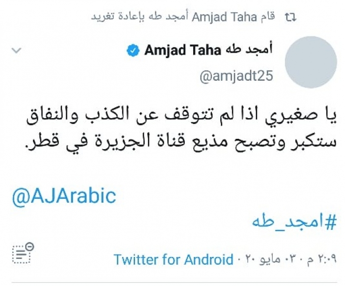 وقال في تغريدة عبر "تويتر" رصدها "المشهد العربي": "يا صغيري اذا لم تتوقف عن الكذب والنفاق.. ستكبر وتصبح مذيع قناة الجزيرة في قطر".