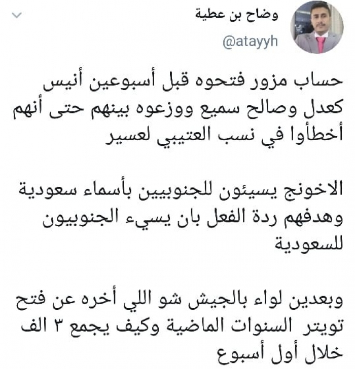 وقال في تغريدة عبر "تويتر" رصدها "المشهد العربي": "حساب مزور فتحوه قبل أسبوعين أنيس كعدل وصالح سميع ووزعوه بينهم حتى أنهم أخطأوا في نسب العتيبي لعسير الإخوانج يسيئون للجنوبيين بأسماء سعودية وهدفهم ردة الفعل بأن يسيء الجنوبيون للسعودية".