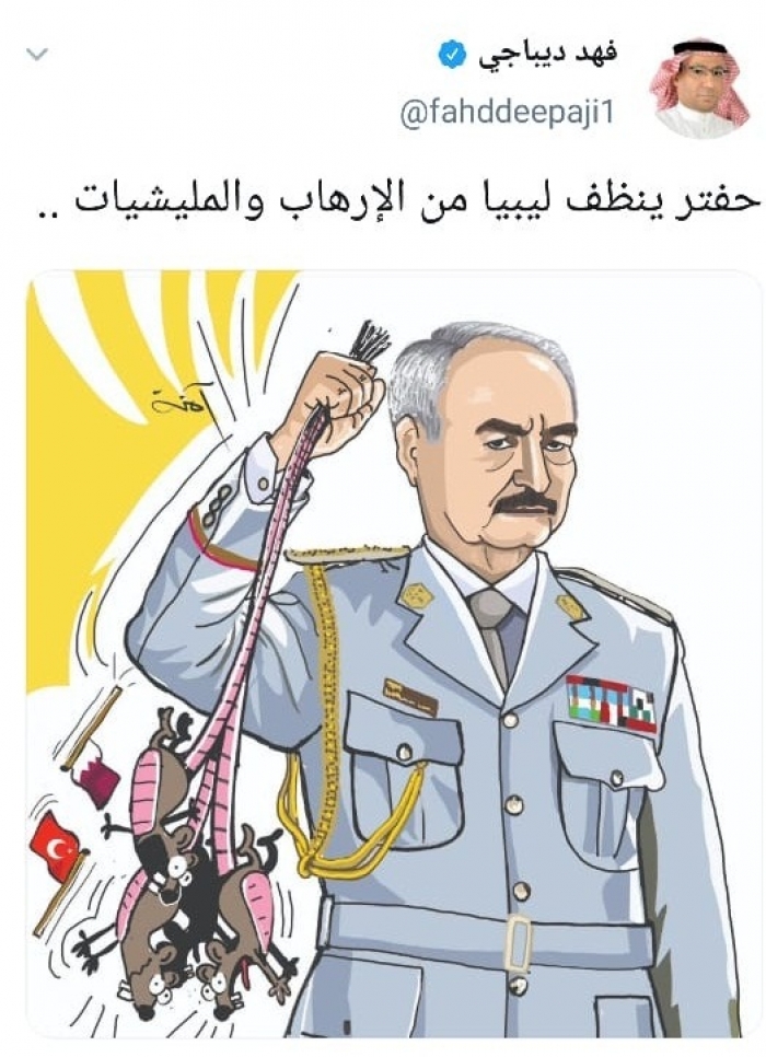 وقال في تغريدة عبر "تويتر" رصدها "المشهد العربي": "حفتر ينظف ليبيا من الإرهاب والمليشيات".