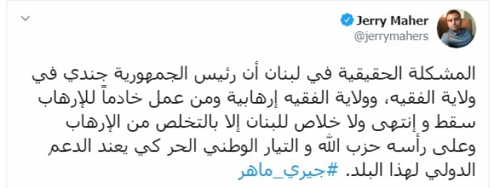 وكتب ماهر عبر تغريدة له على "تويتر" رصدها" المشهد العربي":"المشكلة الحقيقية في لبنان أن رئيس الجمهورية جندي في ولاية الفقيه، وولاية الفقيه إرهابية ومن عمل خادماً للإرهاب سقط و انتهى".
