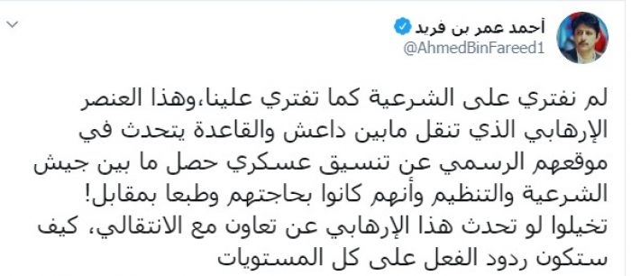 وكتب بن فريد:"لم نفتري على الشرعية كما تفتري علينا،وهذا العنصر الإرهابي الذي تنقل مابين داعش والقاعدة يتحدث في موقعهم الرسمي عن تنسيق عسكري حصل ما بين جيش الشرعية والتنظيم وأنهم كانوا بحاجتهم وطبعا بمقابل".