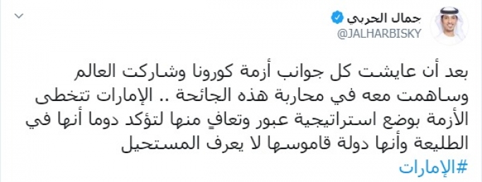 وكتب الحربي عبر تغريدة له على "تويتر" رصدها " المشهد العربي":"بعد أن عايشت كل جوانب أزمة كورونا وشاركت العالم وساهمت معه في محاربة هذه الجائحة، الإمارات تتخطى الأزمة بوضع استراتيجية عبور وتعافٍ منها".