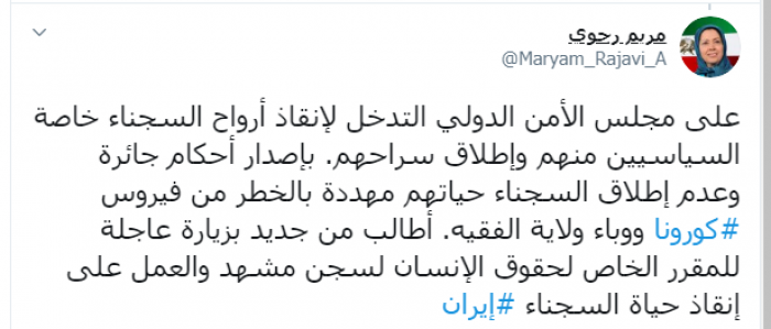 وأضافت:"بإصدار أحكام جائرة وعدم إطلاق السجناء حياتهم مهددة بالخطر من فيروس كورونا ووباء ولاية الفقيه. أطالب من جديد بزيارة عاجلة للمقرر الخاص لحقوق الإنسان لسجن مشهد والعمل على إنقاذ حياة السجناء".